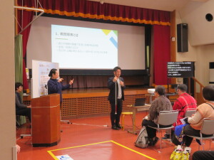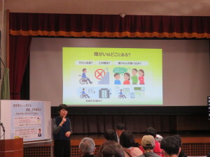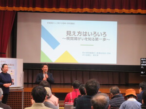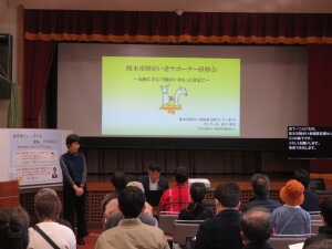 始めに熊本市障がい者相談支援センターきらりの 森下憲司さんによる「障がい者サポーター研修会」を、続いて熊本県視覚障がい者福祉協会・団体の東和孝さんによる「視覚障がいに関する理解・啓発講演会」を行いました。