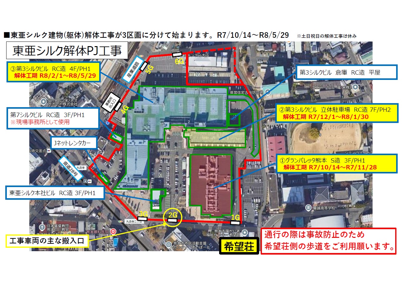 東亜シルク解体工事に関するお知らせ 2025年10月8日 最終更新日時 : 2025年10月8日 希望荘事務局 読み上げる ※画像をクリックすると拡大します希望荘近隣にある東亜シルク敷地内(イオン熊本中央店、グランパレッタ他)の解体工事が上画像の①~③の順番で始まります。 希望荘に来館される際は十分ご注意ください。