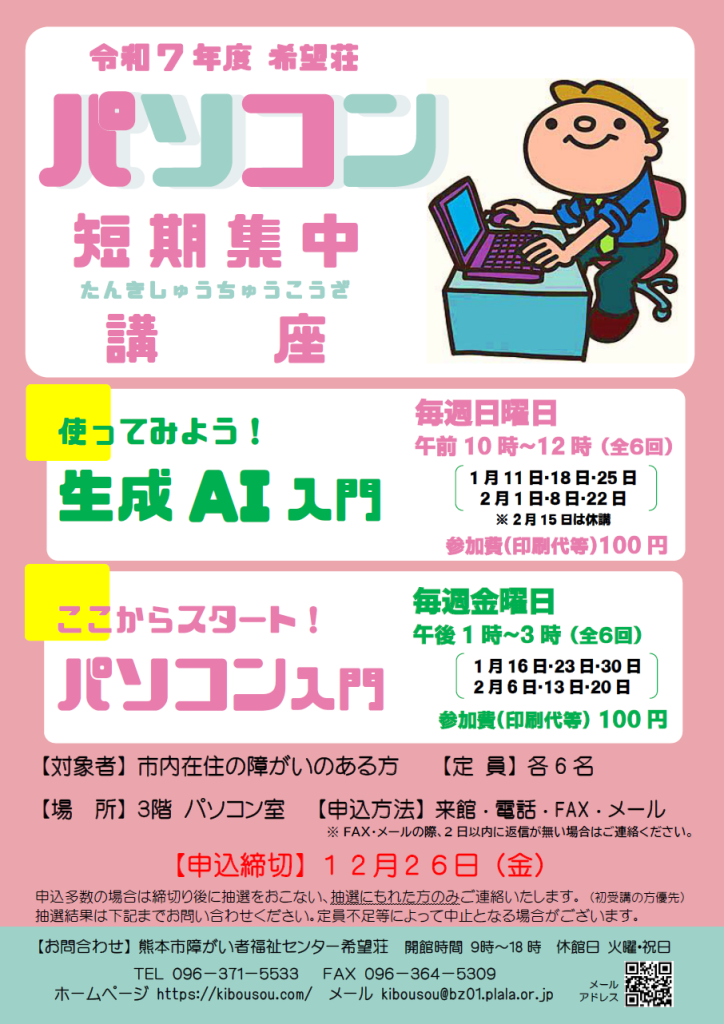・申し込みの際に、希望講座・お名前・住所・連絡先・障がい種別などをお伝えください。