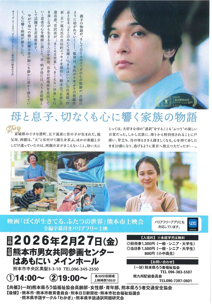 熊本県ろう者福祉協会より「僕が生きてる、ふたつの世界」上映会のご案内 2026年1月30日 最終更新日時 : 2026年1月30日 希望荘事務局 【お問い合わせ】 一般財団法人熊本県ろう者福祉協会 (電話) 096-383-5587 (FAX) 096-384-5937 (Mail) kshk@muse.ocn.ne.jp